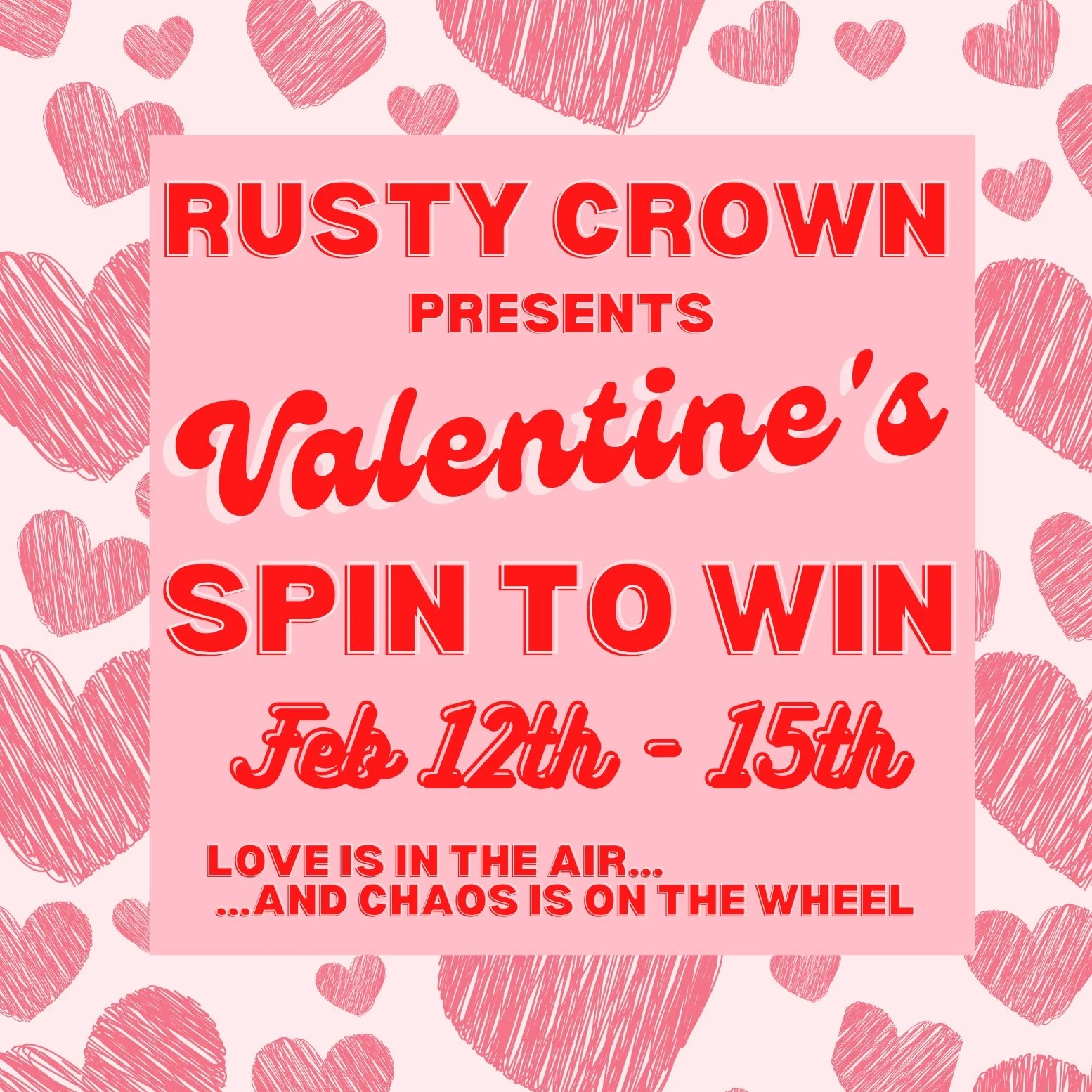 Love it, hate it, or totally over it—Valentine’s Day just got more fun at the Rusty Crown. Stop in and take a spin on our Valentine’s Day prize wheel for discounts, treats, surprises, and a little bit of chaos. From sweet deals to weird love wins (and maybe a heartbreak or two), every spin is part of the fun. No date required—just bring yourself and a sense of humor. ❤️🖤